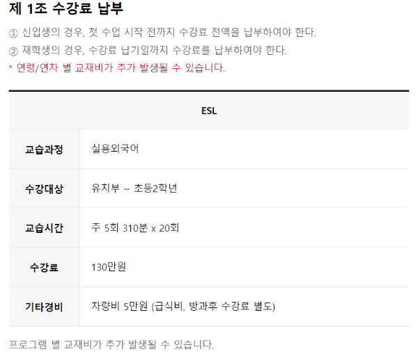 세종시에 영어 유치원을 검색하면 몇 군데 나오는 것 같은데, 내가 자주 들어보고 익숙한 아이가르텐과 폴리 어학원 두 곳만 비교해 보았다. 가장 궁금한 점은 비용이 얼마나 드느냐 하는 것이다. 위에 표에 보면 월평균 100만 원 수준이라고 하는데, 정확한 수치가 궁금했다. 가장 정확한 정보는 유선 통화를 하든지 설명회에 참석해야겠지만 나는 인터넷 서치로만 정보를 찾았다. 두 곳 사이트 모두 FAQ에서 안내하기를 학원비는 프로그램마다 상이하니 유선연락 달라고 했다. 좀 더 찾아보니 아이가르텐은 "학원 소개 -> 학원 규정"에서 수강료 조항에서 비용을 찾을 수 있었다. 폴리어학원은 "학원정보 및 교습비 안내 -> 교습비 규정"에서 찾을 수 있었다.